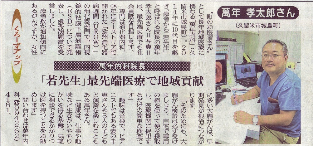 2014年3月22日より萬年家9代目医師である父 萬年孝哉(大先生)より「10代目《として院長職を受け継ぎました。地域住民の方々と触れ合い、健康増進・悩みにも耳を傾けながら、我が”城島町”をはじめ、小さいながらも地域医療の一歯車として貢献していきたいと思います。