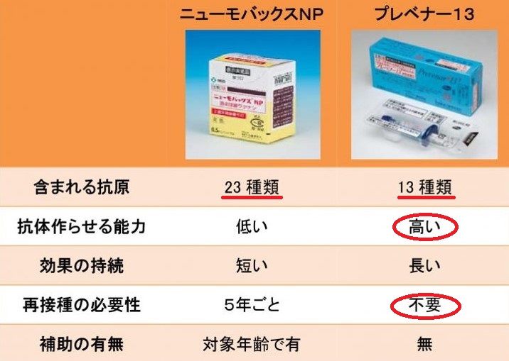肺炎球菌予防接種は、定期接種でも使用されている「ニューモバックス 23」と、もう1つのワクチン「プレベナー 13の」2種類があります